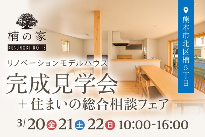 見学会【熊本市北区】リノベーションモデルハウス「楠の家」完成見学会 + 住まいの相談フェア受付中 2026.03.20(金)~22(日) 時 間 10:00-16:00 場 所 熊本市北区楠 詳しく見る -