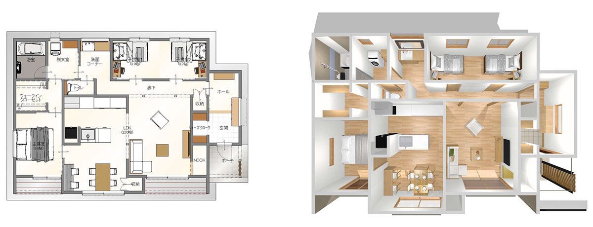 間取りを見直すことで、ひとつながりの広々としたLDKと、新産住拓ならではの国産材の木の温もりに包まれた、心安らぐ空間が広がります。