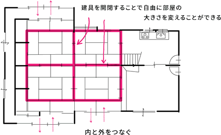 「田の字型間取り」は、建具などを使って自由に部屋の大きさを変えることができ、その場で必要に応じた空間を作ることができます。