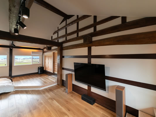 梁や桁を再利用して、構造としてだけではなく、真壁造りなどを用いてデザインの一部として活かしたことで、古民家の持つ“構造美” や“経年美” を木の温もりが感じられる空間に。