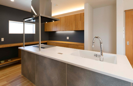 独立した島(アイランド)のように配置されており、デザイン性に優れたキッチンです。