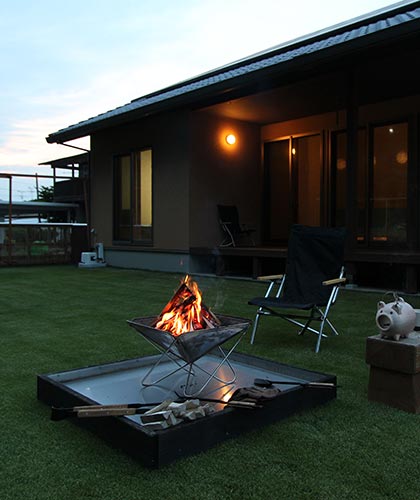 天気がいい日は庭でごはん作って食事をしたり、涼しい夜はゆっくり焚火しながら、マッタリしてます。