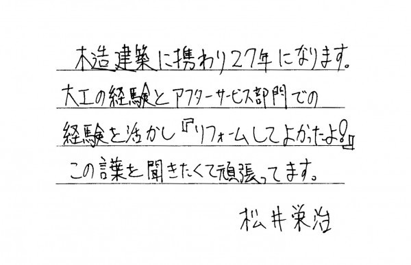 その時に携わった建物の加工や仕上材造作などの経験のおかげで、リフォーム後のきれいな仕上がりを考える事ができ、今の仕事に役立ってます。