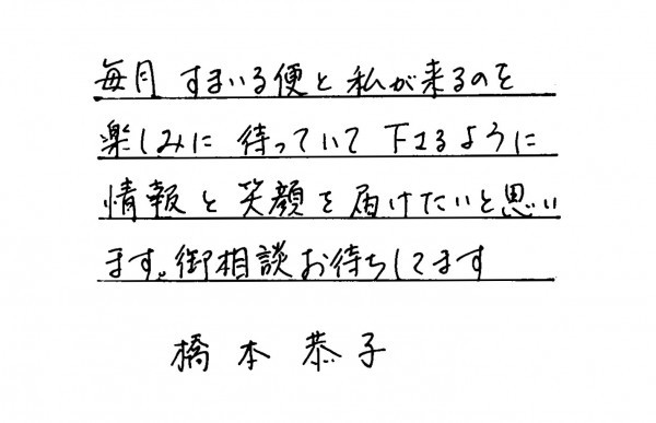 毎月訪問して、ちょっとしたお手伝いやお困りごとに対してアイデアを出して、少しでも暮らしが快適に改善できるようお手伝いをしていきたいです。