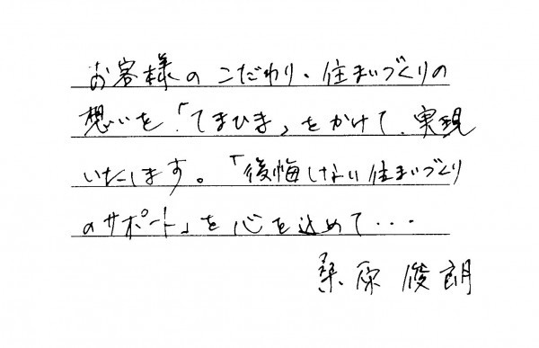 お客様のご希望を叶えることが私たちの使命であり、結果それが「幸せづくり」に通じ、会社にとっても住まいづくりを通じて「地域に無くてはならない存在・企業」になることであると思っています。