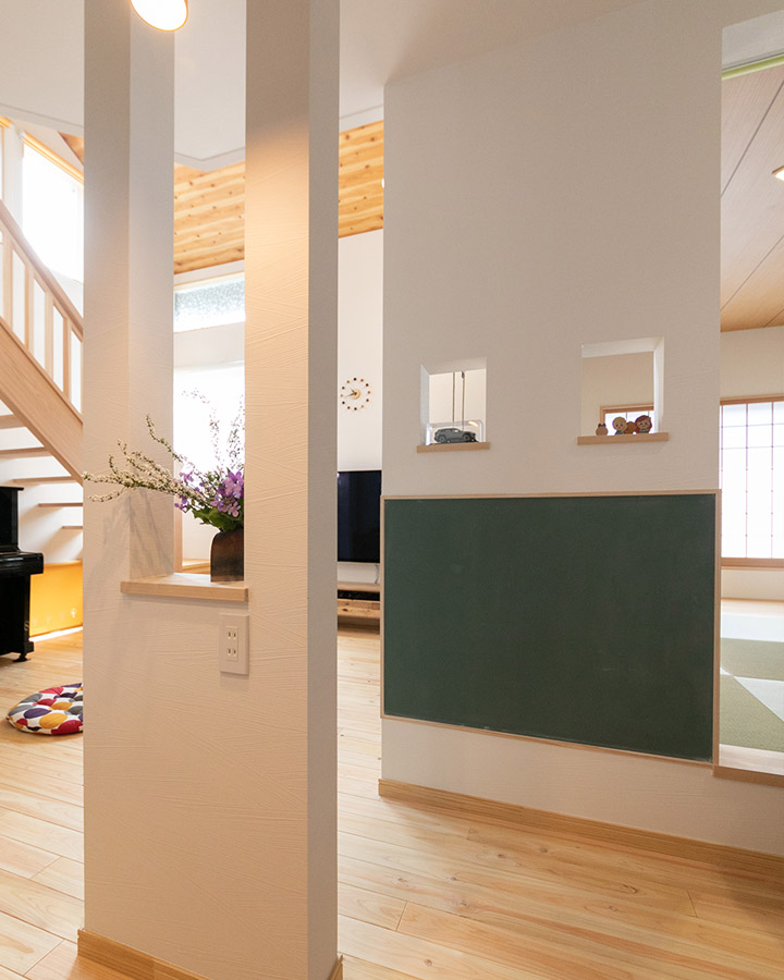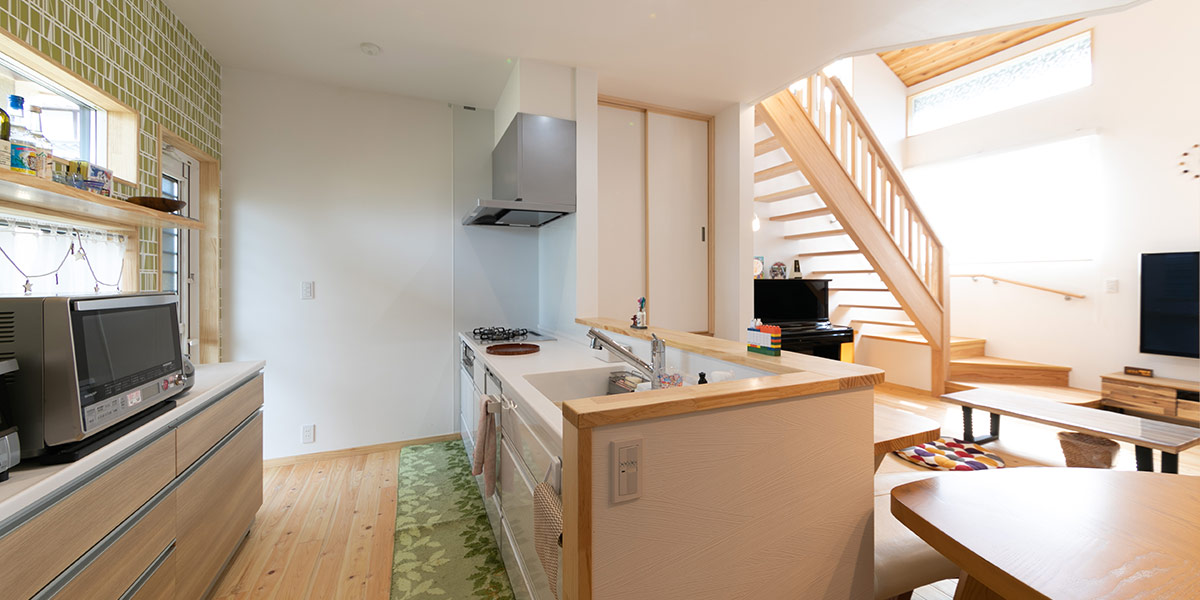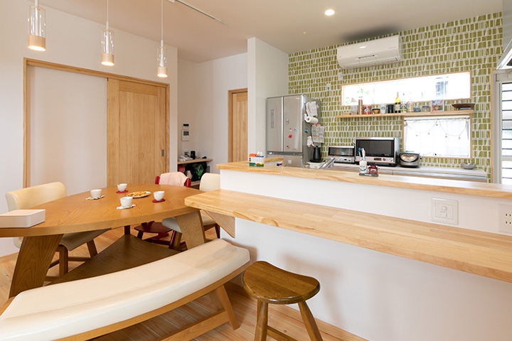また、キッチンを対面式にしたことで、いつでも小さな子どもに目が届くようになり、安心できる間取りに。 -