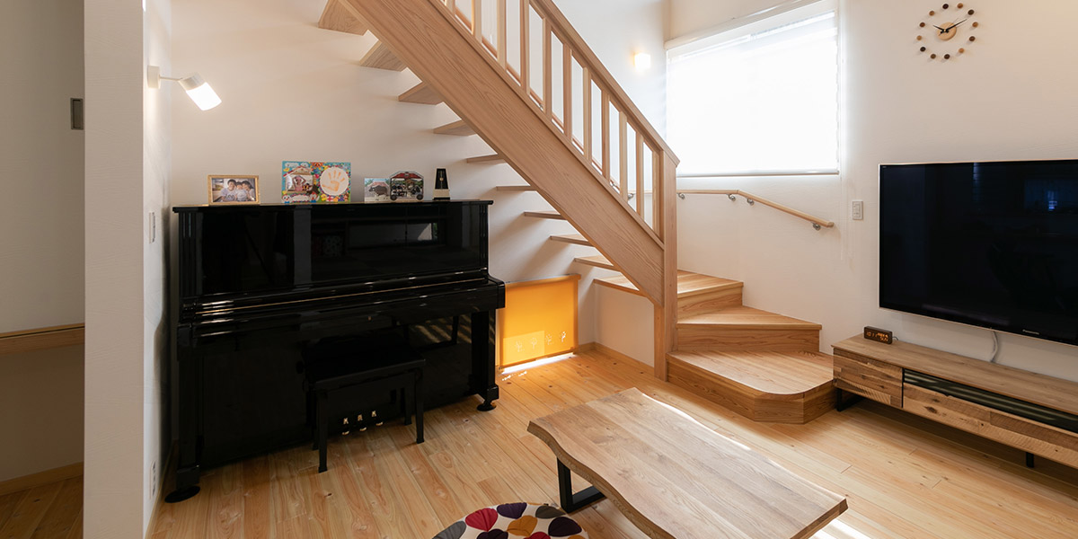 階段の位置にもこだわりました。家に帰って、玄関からそのまま2階に上がるのではなく、リビングを通って2階へ行けるように、階段をリビングに配置してもらいました。