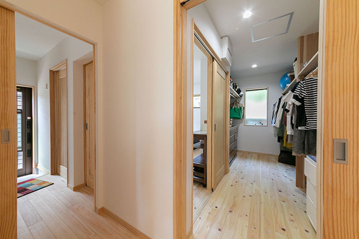 また、そこから続く廊下には、子どもたちの学校の道具や制服をしまえる収納スペースを設けました。