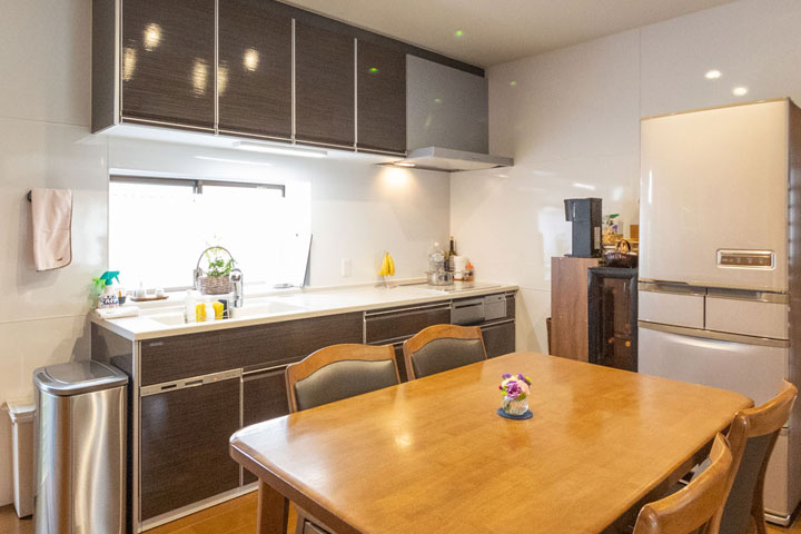 L型からI型のキッチンへ変えて、お手入れもラクに!リフォーム前はL型の大きなキッチンで、お掃除に時間がかかっていたので、新しいキッチンは汚れが落ちやすい素材のI型キッチンに。