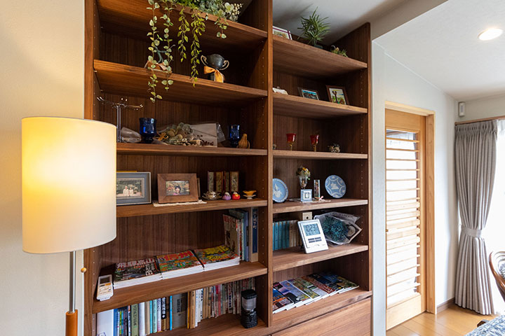 また、リビングにはウォールナット材を使った本棚を作ってもらいました。