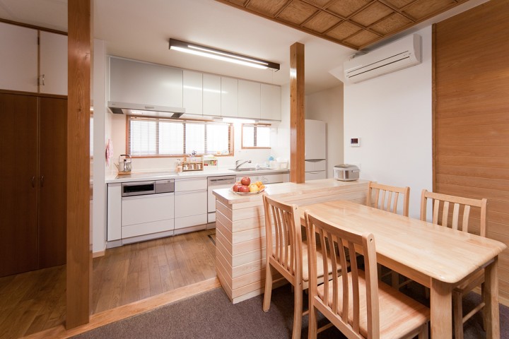 「お店で仕事をしながら、子どもたちの様子がわかるようにしたい」と、お店から直接つながるようにダイニングキッチンを設けたことで、「仕事の合間に子どもたちの世話や夕食の準備ができて、時間にも心にもゆとりが生まれました」(娘様談)。