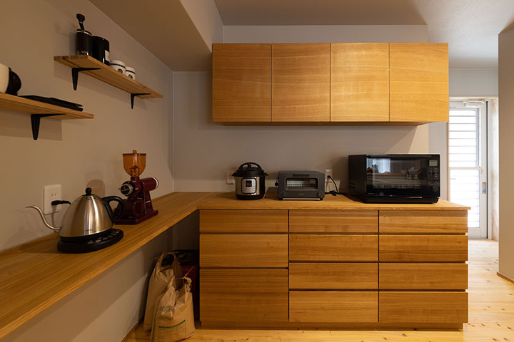 キッチンの背面収納は、いつも使っている食器や家電の大きさに合うように作っていただきました。