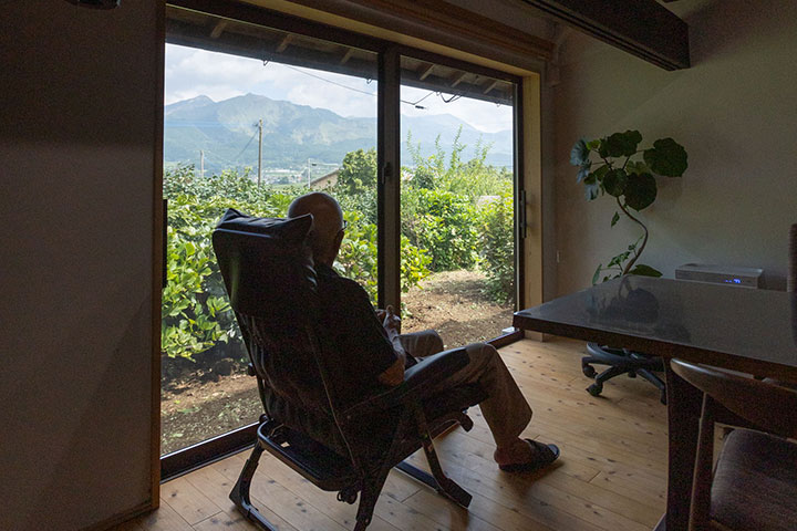 阿蘇五岳を望めるダイニングで、父がコーヒーを飲みながらくつろいでいるのを見るのは、私も嬉しいです。 -