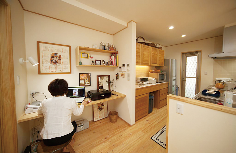 キッチンの横には奥様のお仕事スペースを設けられました。退職後もパソコンやインターネットを使ってお仕事を続けられていて「お料理をしながらでもパソコンに向かうことができるので、ここにいる時間が一番長いんですよ」と喜ばれています。